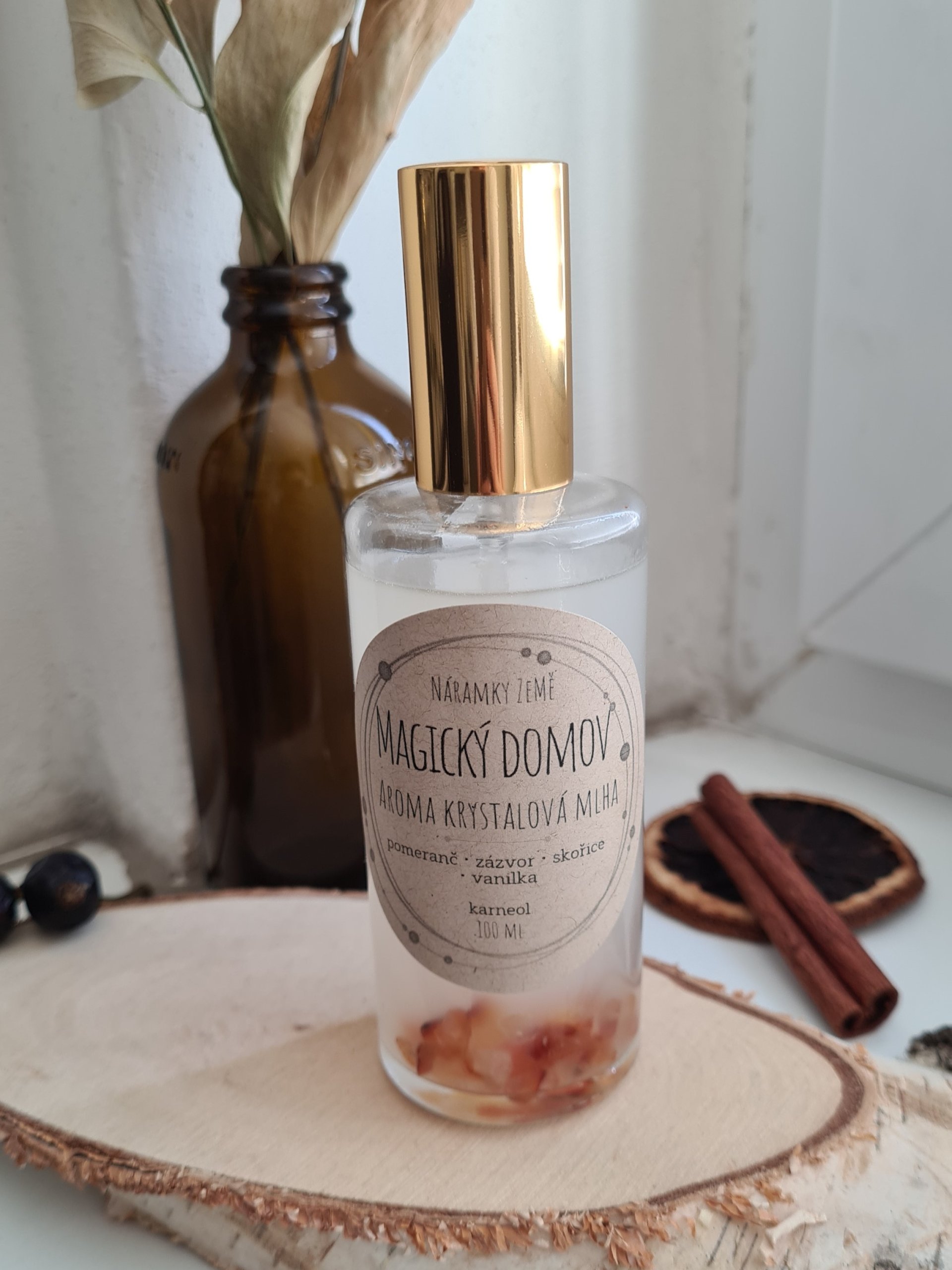 Mlha Magický domov s kombinací vůní pomeranč, zázvor, skořice a vanilka s krystalky karneolu je tak vhodná pro všechny, kdo si potřebují odpočinout, zpomalit a zlepšit náladu.